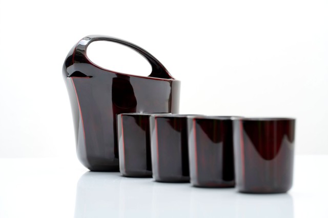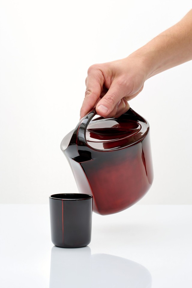 Dans la continuité de nos recherches et expérimentations, nous avons abordé le sujet des arts de la table sur le principe de la thermochromie appliqué à la laque végétale. Un changement de couleur s’opère à la surface de l’objet en fonction de la température de l’eau.